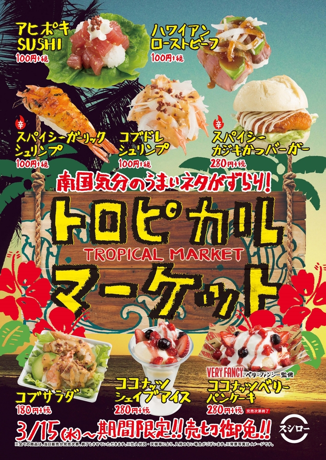 株式会社あきんどスシロー(本社:大阪府吹田市、代表取締役社長 CEO:水留 浩一)は、ご家族やご友人とのおでかけの機会が増える春休みのシーズンに合わせて、よりバラエティ豊かなおすしやサイドメニューをお楽しみいただける、スシロー初の南国系フェア『トロピカルマーケット』を期間限定で開催中です。