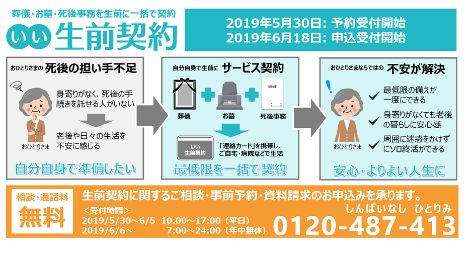 終活関連サービスを提供する株式会社 鎌倉新書(東京都中央区、代表取締役社長:清水 祐孝、証券コード:6184、以下 当社)は、死後の手続きを託す人がいない「おひとりさま」の終活における課題「葬儀・お墓・死後事務」の手続きをサポートする「いい生前契約」のサービス提供開始を2019年6月18日に控え、本日2019年5月30日から予約受付を開始しました。また、サービス開始を記念して、身寄りのないおひとりさまを対象に「おひとりさまの終活に関する不安解消講演会・座談会」を開催します。