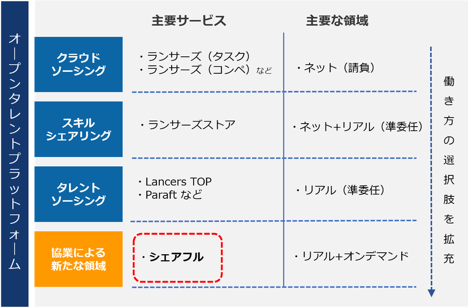 パーソルホールディングスとの業務提携により、新プラットフォーム「シェアフル」において、ランサーズ単体では価値提供が不充分だったオフライン領域の支援を実現していきます。具体的には、『オンデマンド』×『スキマ時間』の働き方を希望する労働者に対して、自分らしい自由な働き方の選択肢を提供いたします。