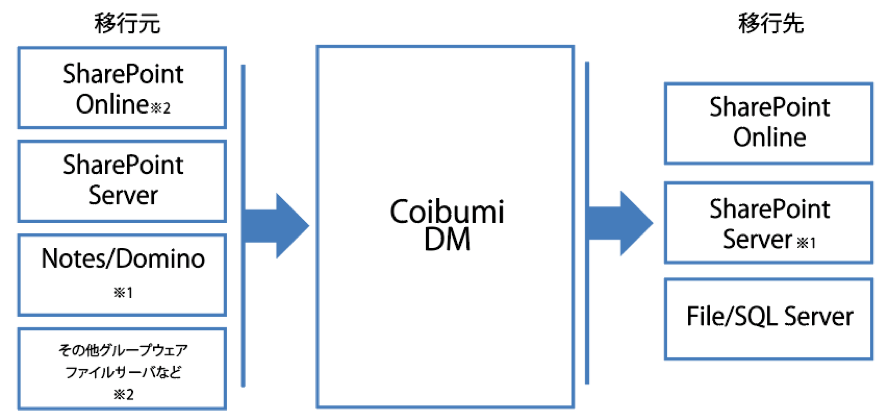 これまでの「Coibumi DM」は、従来のデータ移行ツールとは異なり、サイト構築データとデータベース情報を別々に収集・加工できることが大きな特長でした。今回のバージョンアップでは、データ移行元としてNotes/Domino、データ移行先としてSharePoint Server 2016を追加しました。これは、昨年発表されたIBM社のNotes事業売却により、今後Notes/Dominoを利用している企業によるSharePoint等の他グループウェアへ移行する需要が高まることを想定したものです。