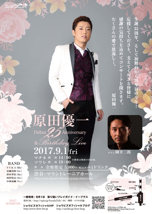 株式会社ショウビズ(所在地:東京都世田谷区、代表取締役:坂紀史)に所属し、ミュージカルを中心に活躍する俳優・原田優一(34)がデビュー25周年を記念して、9月1日(金)の誕生日にあわせて、デビュー25周年&バースデー記念ライブを東京・渋谷 Mt.RAINIER HALL SHIBUYA PLEASURE PLEASURE(マウントレーニアホール プレジャープレジャー)にて開催いたします。
