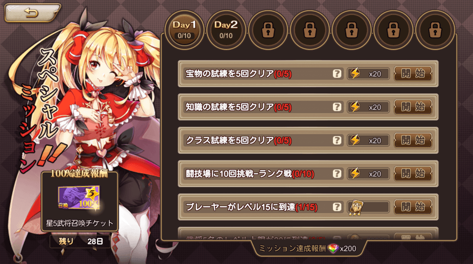 「七日スペシャルミッション」は七日間の間に指定されたミッションをクリアしていくと様々な報酬がもらえる特別ミッション。さらに、ゲーム内の便利なアイテムやダイヤがもらえるだけではなく、「七日スペシャルミッション」を全部クリアすると「星5武将確定チケット」がもらえます。