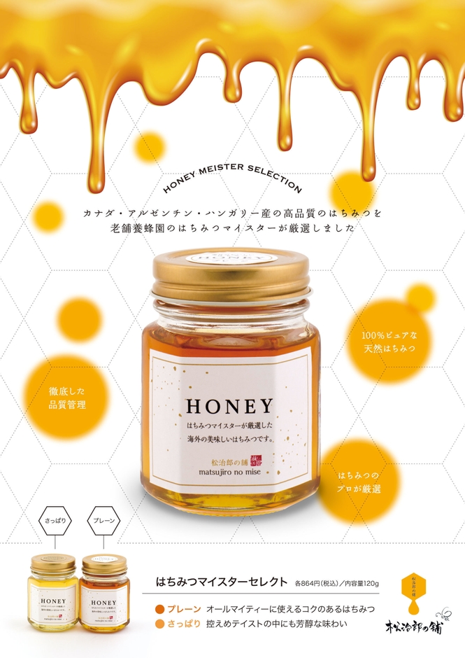 創業大正元年のはちみつ屋、株式会社松治郎の舗(所在地:三重県松阪市、代表:水谷 俊介)は、味のコクの違いによるはちみつの使い方提案として、はちみつマイスターセレクションシリーズ「プレーン」・「さっぱり」各120gを2017年10月14日から発売いたします。