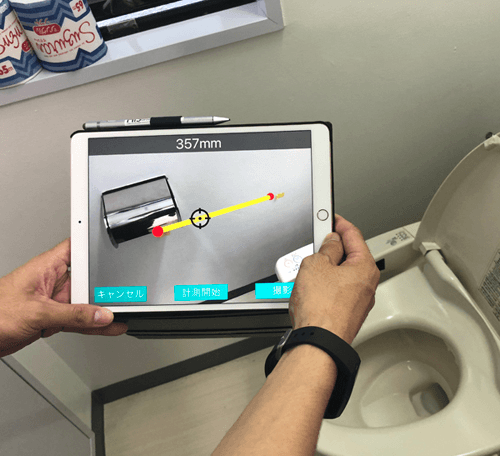 さらに2018年には、リフォーム業界初の見積作成AIアプリシステム『FUS II』(特許第6391206号)を開発。11月から直営店にてテスト運用をスタートしています。現地調査の訪問時に専用タブレット端末でアプリを立ち上げリフォーム希望箇所を撮影するだけで寸法を自動で算出し、部材の選択やクラウド上で過去の工事実績と照合することができます。