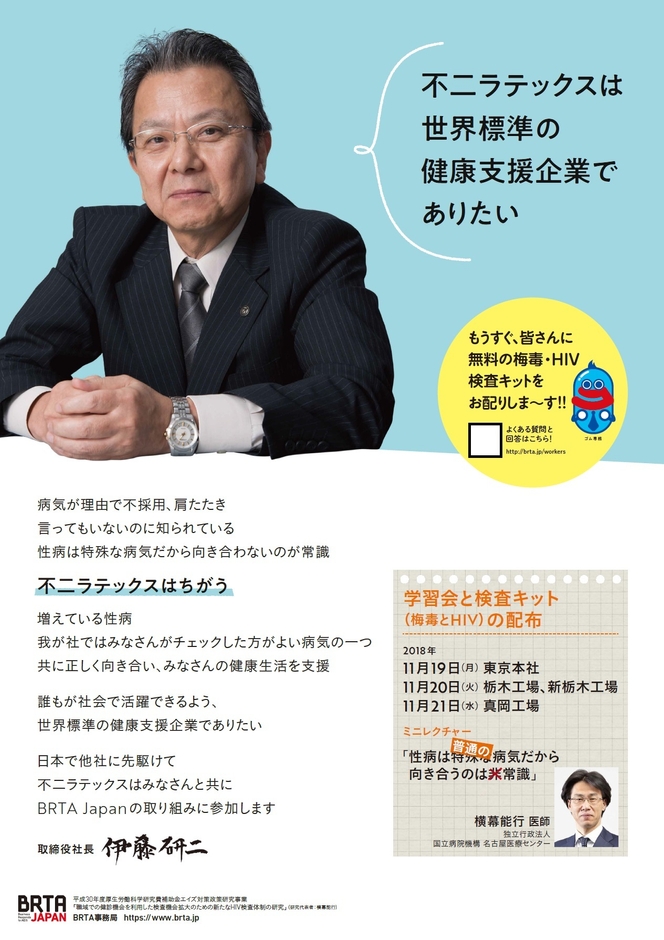 不二ラテックス株式会社(東京都千代田区、代表取締役社長 伊藤 研二)は、BRTA Japan(Business Responds to AIDS Japan、研究代表者:横幕 能行 名古屋医療センター・医師)と協力し、12月1日(土)の「世界エイズデー」を前に、日本初となる、企業内検診の一環として、代表的な性病であり、現代でもなお対策が重要視されている梅毒とHIV感染症/エイズの検査(「HIV検査」※1)機会を全従業員に対して提供する試みを実施し、検査を通じて正しい知識と意識の向上を深める取り組みを開始致します。