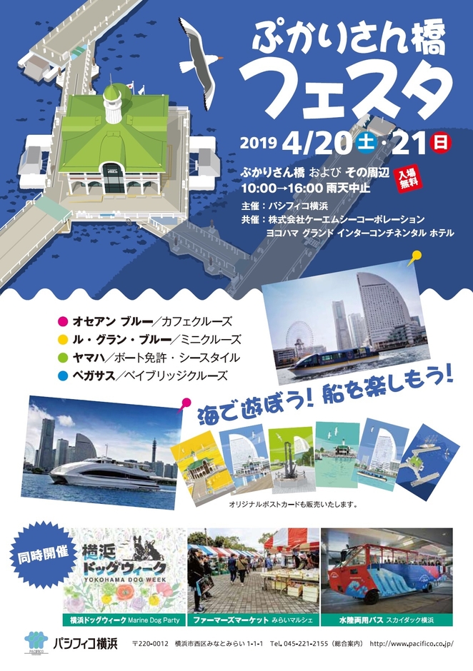 パシフィコ横浜(正式名称:株式会社横浜国際平和会議場、所在地:横浜市西区、代表取締役社長:中山 こずゑ)は、株式会社ケーエムシーコーポレーション(所在地:横浜市西区、代表取締役:熊澤 喜一郎)とヨコハマ グランド インターコンチネンタル ホテル(会社名:株式会社横浜グランドインターコンチネンタルホテル、所在地:横浜市西区、代表取締役社長:梅村 東)を共催として、2019年4月20日(土)~4月21日(日)の2日間、みなとみらい21地区初の『よこはま・みなとみらい海の駅』認定1周年記念イベント『ぷかりさん橋フェスタ』を開催します。