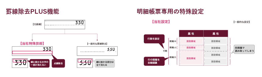 DynaEyeは、シリーズ累計6,500社での導入実績を誇り、AIでフリーピッチ手書き文字の読み取り精度を大幅に向上するなど、高精度な文字認識を実現するソフトウェアです。さらに、さくら情報システムが罫線除去機能「罫線除去PLUS」と明細行のハンドリング機能「明細帳票専用の特殊設定」を追加しました。これらの技術により読み取り精度をさらに向上し、申込書・請求書・見積書などの定型帳票に加え、複数フォーマットが混在する帳票を高い精度で読み取ることが可能になりました(2020年6月現在は活字のみ対応)。DynaEye10と特殊機能を組み合わせることで、効率的に紙のデータ化に対応いたします。