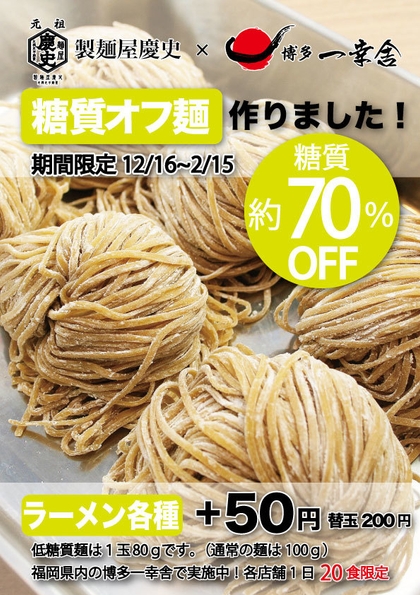 製麺屋慶史×博多一幸舎 福岡県内の博多一幸舎にて、 糖質70%OFF『糖質オフ麺』が12月16日(土)より発売