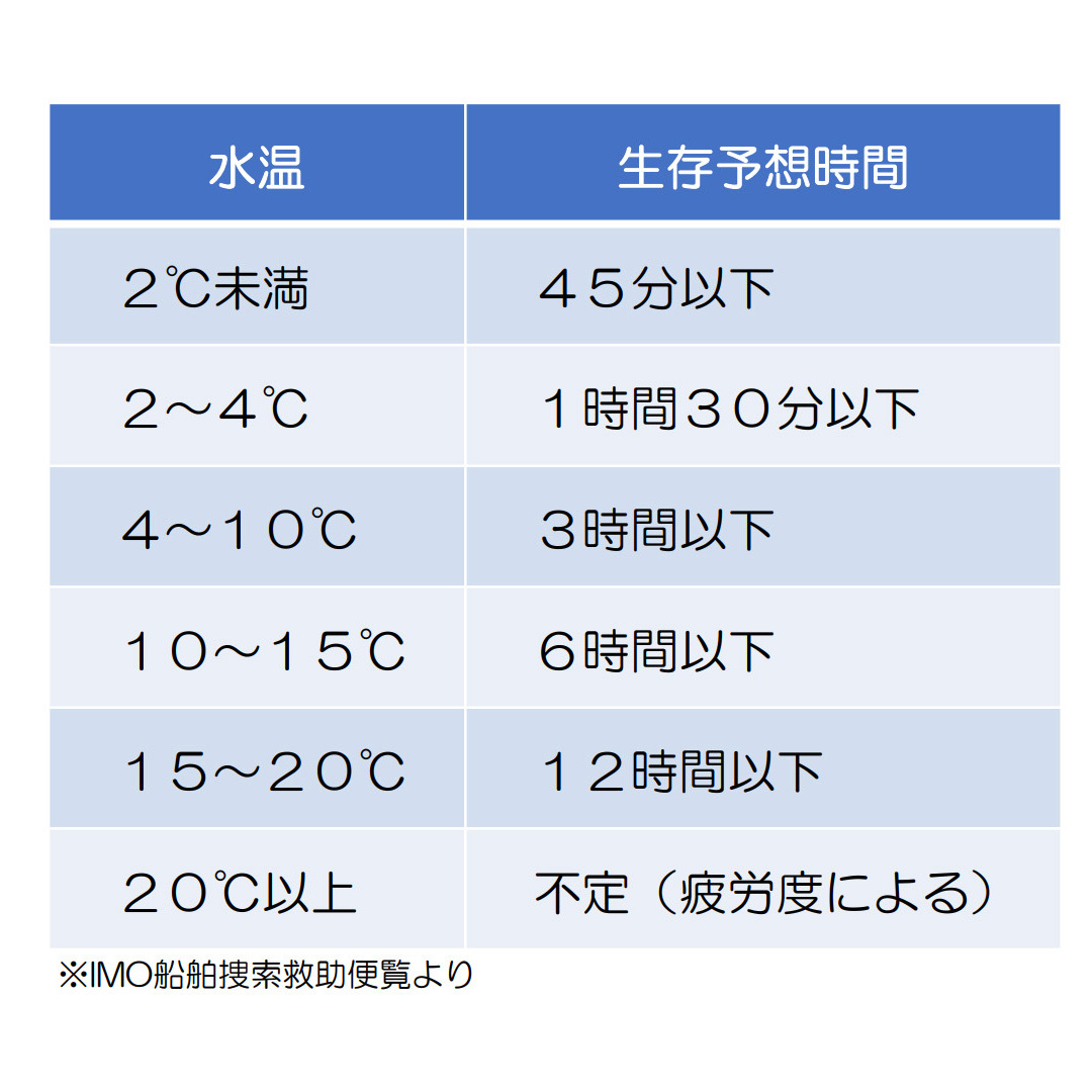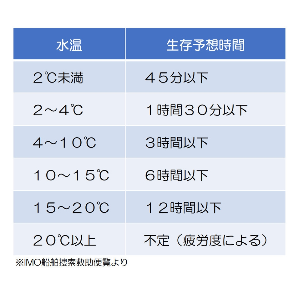 急激な冷えにより体が動かなくなり漂流してしまうとデータのように生存確率が下がります。これらを防ぎ、安全に釣行をしていただきたいです。