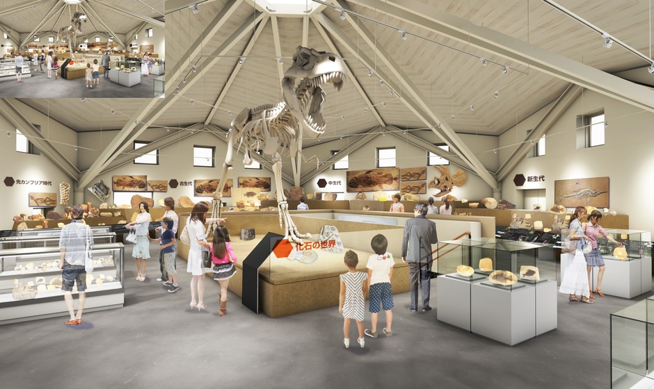 これらは、玄武洞に纏わる“石の展示”をメインに、“地質の歴史”から“生物、生命の歴史”へと解説の幅を広げ、訪れる来館者の皆様の様々な目的に応えられる展示構築を行いました。更に飲食・物販棟も充実させ、全く新しいオリジナルメニューを提供いたします。
