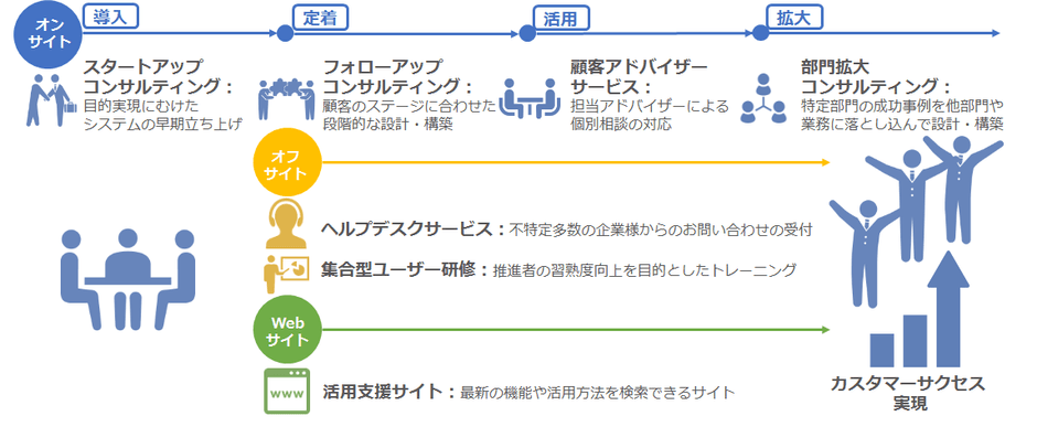 具体的には、従来型のスタートアップコンサルティングに加え、導入後のお客様の様々なステージに合わせて行うフォローアップコンサルティングを新設。さらに、特定部門の成功事例を他部門や業務に落とし込む部門拡大コンサルティングメニューも用意しました。
