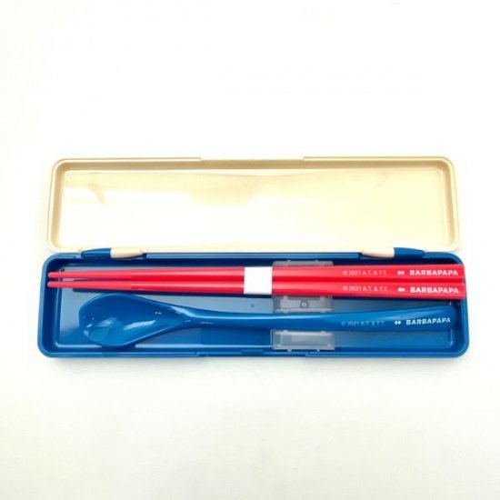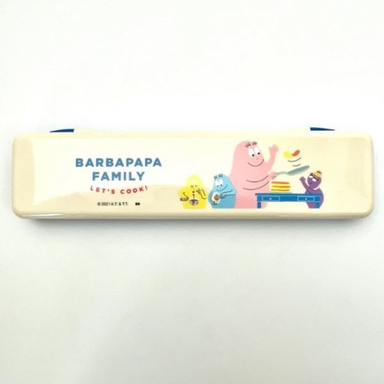可愛いカラーのカトラリーセット♪フタ部分にはカラフルなバーバパパたちがクッキングを楽しんでいる様子が!
