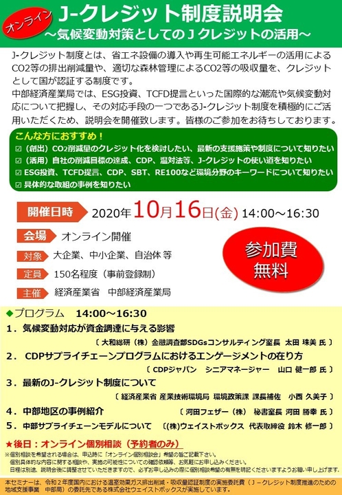 中部経済産業局では、国際的な潮流や気候変動対応について把握し、その対応手段の一つであるJ-クレジット制度を積極的にご活用いただくため、説明会を開催致します。皆様のご参加をお待ちしております。