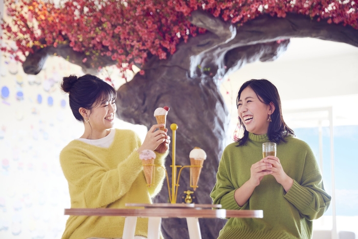 カフェの入口には、熱海梅園で多く咲く品種「八重寒紅(やえかんこう)」の色味になぞらえた、梅の木の装飾が設えられます。見上げると、まるで満開に咲き誇る梅に包まれているかのような気分を味わえます。幹に付いている蛇口から出てくるのは梅ジュースです。梅のさっぱりとした風味を味わいながら、春の訪れを感じられます。