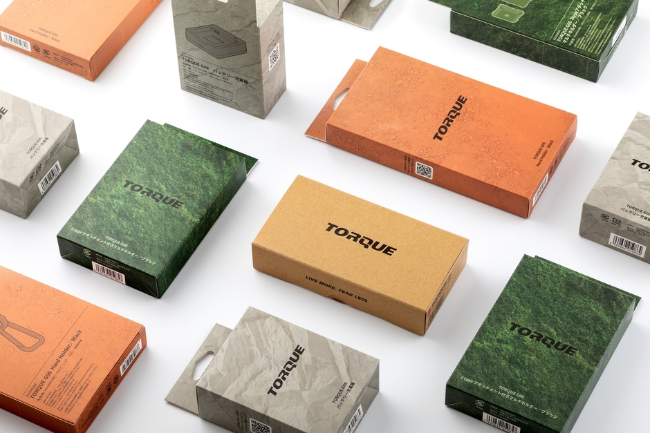 TORQUEは、過酷な環境下でも使用できる高耐久性から、多くのアウトドアユーザーに愛されるスマートフォンです。昨今の環境意識の高まりを受け、シリーズ全体を紙パッケージへと切り替えています。段ボールを起用したTORQUE G06本体の箱は、ブランド品位と環境負荷低減を両立したデザインです。内蓋には文字抜き加工を施し、開封の瞬間からTORQUEの世界観を感じられるよう仕上げました。アクセサリの箱は、TORQUEが活躍するフィールド の広がりを連想させるグラフィックデザインとしています。