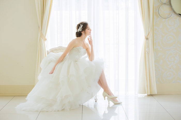 デコルテラインを愛らしく魅せるクラシカルなオフショルダーと、ウエストラインを美しくするプリンセスのようなシルエットにこだわったドレス。