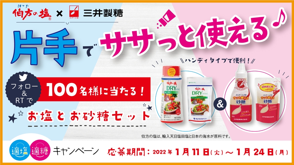 伯方塩業株式会社(本社:愛媛県松山市、代表取締役社長:石丸 一三)と三井製糖株式会社(本社:東京都中央区、代表取締役社長:森本 卓)は、「適塩適糖キャンペーン」を開催します。第1弾となるTwitterキャンペーンは、塩の日である2022年1月11日(火)スタート!片手でササっと使えるお塩とお砂糖セットを抽選で100名様にプレゼントします。