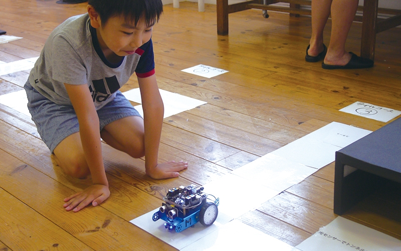 mBotがコース上を走るようにプログラミングを組んで、完走を目指します。 時間内に1番早く完走できた子が優勝です。