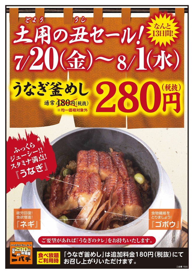 株式会社ヨシックス(所在地:愛知県名古屋市、代表取締役会長兼CEO:吉岡 昌成)が運営する全品280円低価格居酒屋「ニパチ」では、今年二回ある土用の丑(うし)の日、7月20日(金)から8月1日(水)の期間中限定で均一価格対象外の特別メニュー『うなぎ釜めし』を通常480円(税抜)から280円(税抜)で提供いたします。