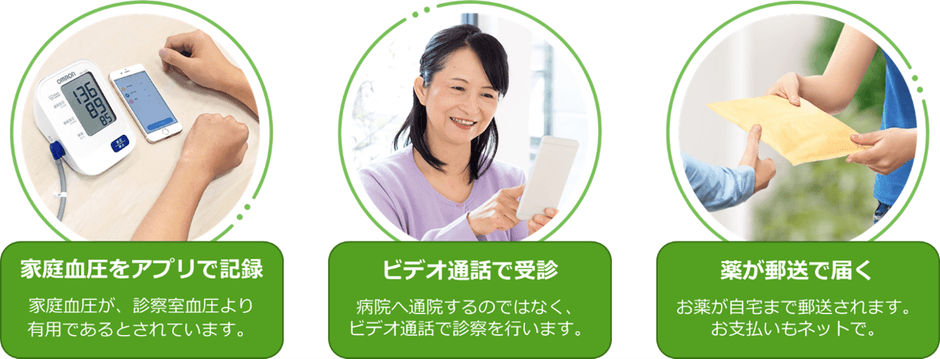テレメディーズ® BPのご利用者様は、日頃の血圧管理から、診療の予約、薬の受け取り、医療費の支払いまで、自宅や職場にいながらにしてすべてをひとつのアプリで済ませることが出来ます。また、スタッフによるきめ細かなサポートを受けられます。