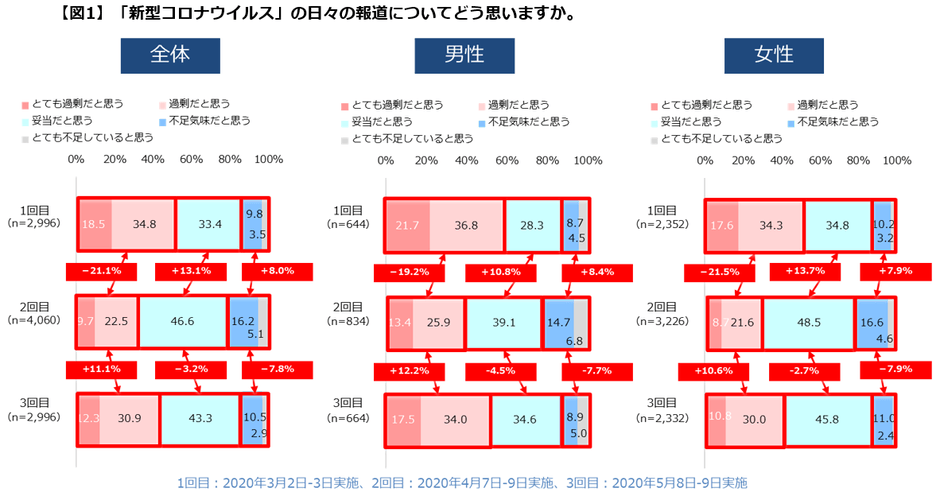 1:新型コロナウイルスの日々の報道について「過剰だと思う」が男女ともに増加。(図1)