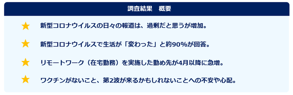 「新型コロナウイルス」により生活が「変わった」と約90%が回答。 「ワクチン」がないこと、「第2波」が来るかもしれないことへの不安や心配が見られる。 ーインサイトテック ユーザーアンケートー