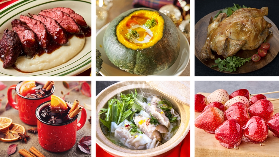 クリスマス定番人気のローストチキンはもちろん、牛ハラミのステーキ、丸ごとかぼちゃスープ、海老クリームソースのペンネ、北欧名物ミートボールなどの洋風メニューに加え、ローストビーフ寿司、旨辛肉盛玉子うどん、ゆずと檸檬が香る餃子鍋、坦々刀削麺といった和や中華までバラエティ豊かなフードメニューをラインアップ。さらに、クリスマスビールやホットチョコレート、ラムショコラ、ホットワインなどのクリスマス感あふれる各種ドリンクに、フルーツサンド、イチゴ飴など見た目も華やかなクリスマススイーツまで、贅沢&多彩なラインナップで皆様のお越しをお待ちしております。
