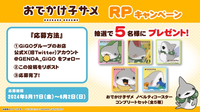 X(旧Twitter)アカウント(https://twitter.com/GENDA_GiGO )をフォローの上で、該当の投稿をリポストされたお客さまの中から抽選で5名様に「ノベルティコースターフルセット(全5種)」をプレゼントいたします。