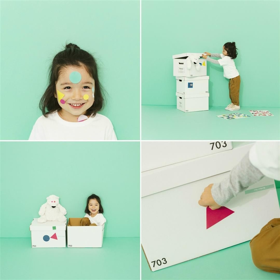 真っ白のボックスに絵を描くように、積み木を重ねるように、カラフルなまる、さんかく、しかくのシールを自由に貼って、家族でハッピーなデザインの収納ボックスを作ることができます。子どもの感性を広げながら、愛着を持ち、物を大切にする気持ちが育くまれることを願い企画・デザインしました。
