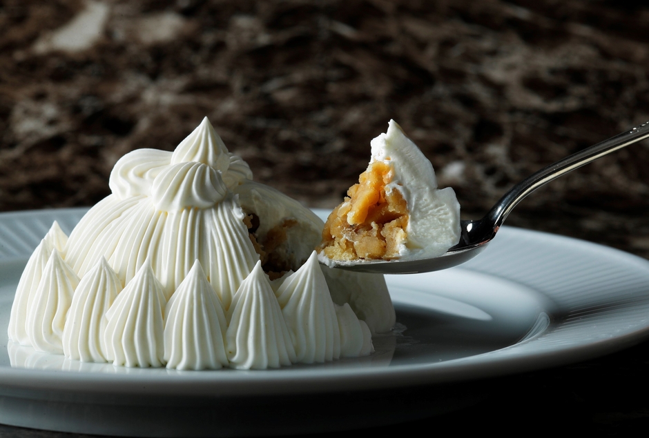メディアでも多数紹介されている人気の「マロンシャンテリー」は約70年前に誕生した東京會舘伝統のスイーツ。生クリームの中には裏ごしした栗が入っています。