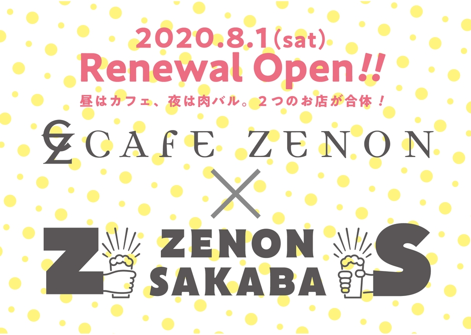 今まで「カフェゼノン」として使用していた場所は、新型コロナウイルスの影響が収束するまでの約1~2年間休業(その後再開予定)とさせていただきます。また、「ゼノンサカバ」として使用していた場所はリニューアルし、昼は「カフェゼノン」、夜は「ゼノンサカバ」として2つの業態でハイブリッド営業をいたします。