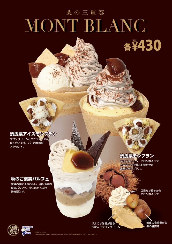 秋シーズンクレープ発売に合わせ、一部店舗を除き、「秋の贅沢パルフェ」もお取り扱いいたします。