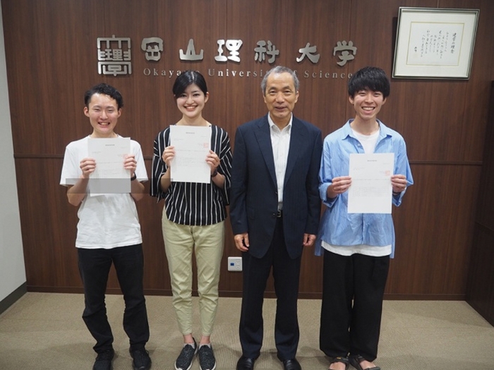 岡山理科大学(岡山市北区理大町)は学生の学外学修活動を経済的に支援する制度「岡理GAP(ギャップ)」を設けており、2019年7月9日、本年度第I期の採択通知書授与式を学長室で行いました。3人が採択され、それぞれ8月から9月にかけてオーストラリアやフィリピンに出発し、1カ月ほど活動します。