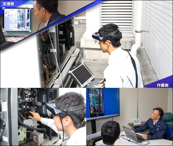 社員育成の場面でも、AceRealの遠隔支援ソリューションを使った新たなOJTのやり方を実現しています。従来のOJTは、ベテラン社員・新人社員の2名で現場へ向かい、現場で実機を取り扱いながら作業を行う中で様々な知識を得ていきますが、AceRealを導入した東京冷機工業では、新人社員がARスマートグラス「AceReal One」を着用し現場で作業を実施、そしてベテラン社員が現場の映像を見ながら事務所から指示・指導を行うことにより、ベテラン社員が現場に向かうことなく従来と同水準のOJTを実現しています。
