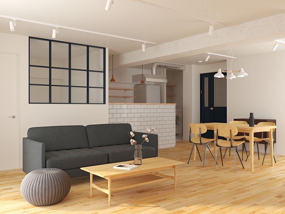 「リノベる。大阪 中津ショールーム」は、ご夫婦+お子様1名の生活をイメージした2LDK+ウォークインクローゼットの間取りを設定しました。