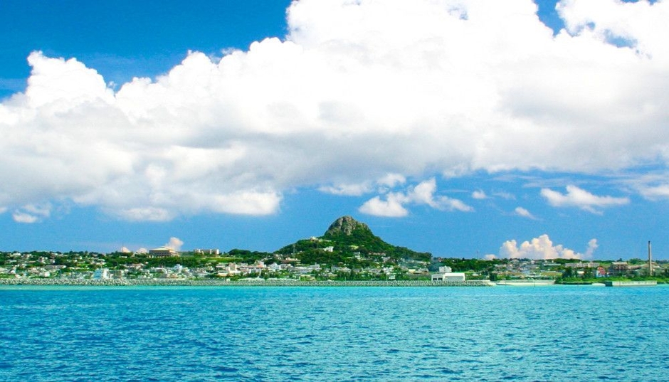 沖縄本島北部、本部半島から北西に9kmの位置にある伊江島。島の中央やや東にそびえる島のシンボル「城山(グスクヤマ)」をはじめ、白い砂と青い海が満喫できるビーチ、海岸線に点在する洞窟、断崖絶壁に湧く水源「湧出(ワジー)」など、数多くの美しい自然に囲まれています。また、1,000品種余のハイビスカスが咲く植物園、多くの戦跡、美しい夜景などみどころも満載です。沖縄美ら海水族館の近くにある本部港から村営フェリーで30分。車で渡ることができるのも魅力の一つです。