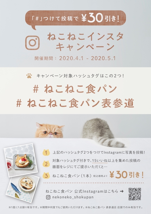 内容: ご自身のインスタグラムに下記の2つのハッシュタグを付けて「ねこねこ食パン」を投稿していただき、「♥15いいね」をゲットすると、ねこねこ食パン1本が30円引きになります。