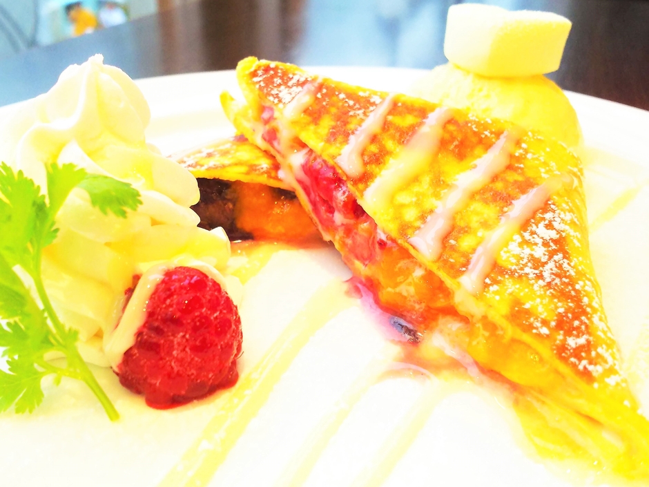 香ばしく焼いたクレープの中にミックスベリーと自家製マンゴージャムを包み練乳ソースと一緒にお召し上がりください。