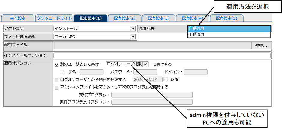 また、管理者は配信設定の際に、配信したFUを即時適用させるか、PC利用者の操作に応じて適用させるかを選ぶことができます。
