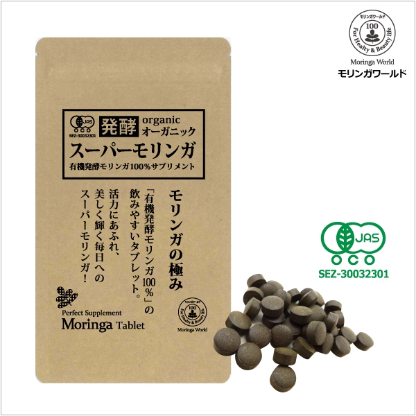 オーガニック発酵スーパーモリンガは、オーガニックモリンガ(有機JAS認証)を乳酸発酵させた有機発酵モリンガ100%タブレット(粒)。「オーガニック・発酵・モリンガ100%・無添加」は国内初(当社調べ)となる有機モリンガサプリメントです。