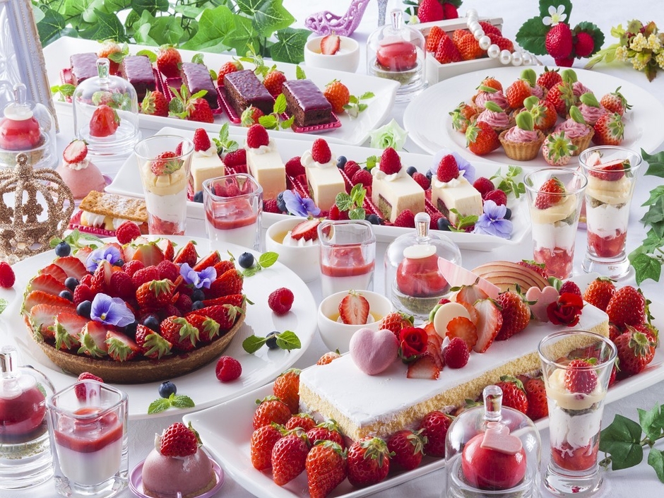 今年のいちごフェアのこだわりは、“見た目も味も贅沢に”。「真っ赤な苺のショートケーキ」や「苺のクロッカンブッシュ」など、いちごのおいしさと可愛さを存分に引き出したスイーツを種類豊富にご用意いたしました。スイーツだけでなくオードブルやピザ・パスタなどの軽食もご提供いたします。