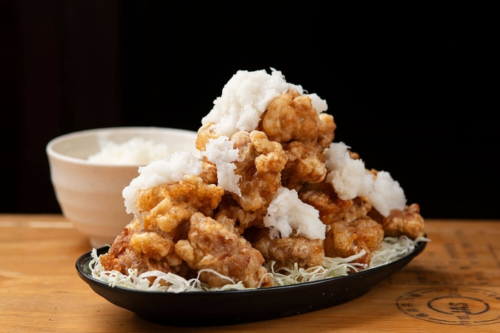 オススメの「からあげ チョモランマ定食」は、なんと15個も金賞受賞からあげを山盛りにのせた定食です。熱々のからあげに大根おろしをお好みでトッピングしていただくとさっぱりお召し上がり頂けます。