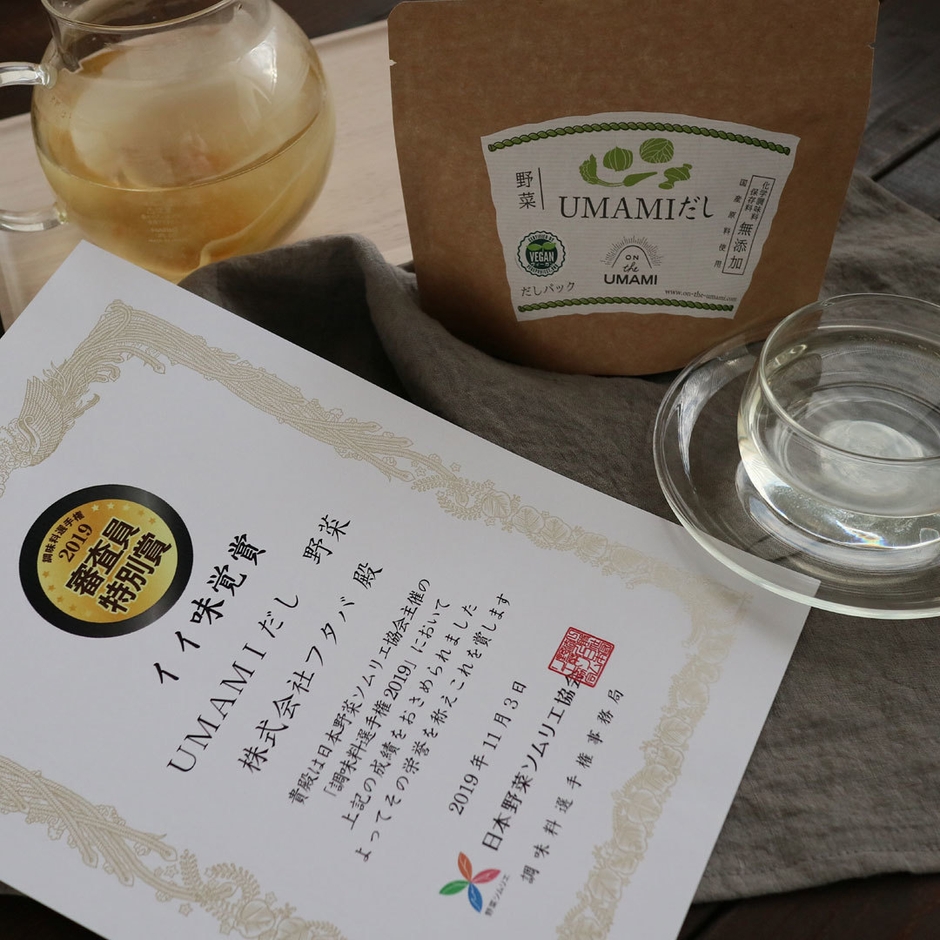 創業65年、だしパックの製造販売を行う株式会社フタバ(代表取締役社長:江口 晃、本社:新潟県三条市)が展開する、BtoCブランド「ON THE UMAMI」の一番人気だしパック「UMAMIだし 野菜」が11月3日の開催されました日本野菜ソムリエ協会主催の「調味料選手権2019」の最終審査会で審査員特別賞「イイ味覚賞」を受賞したことをご報告いたします。