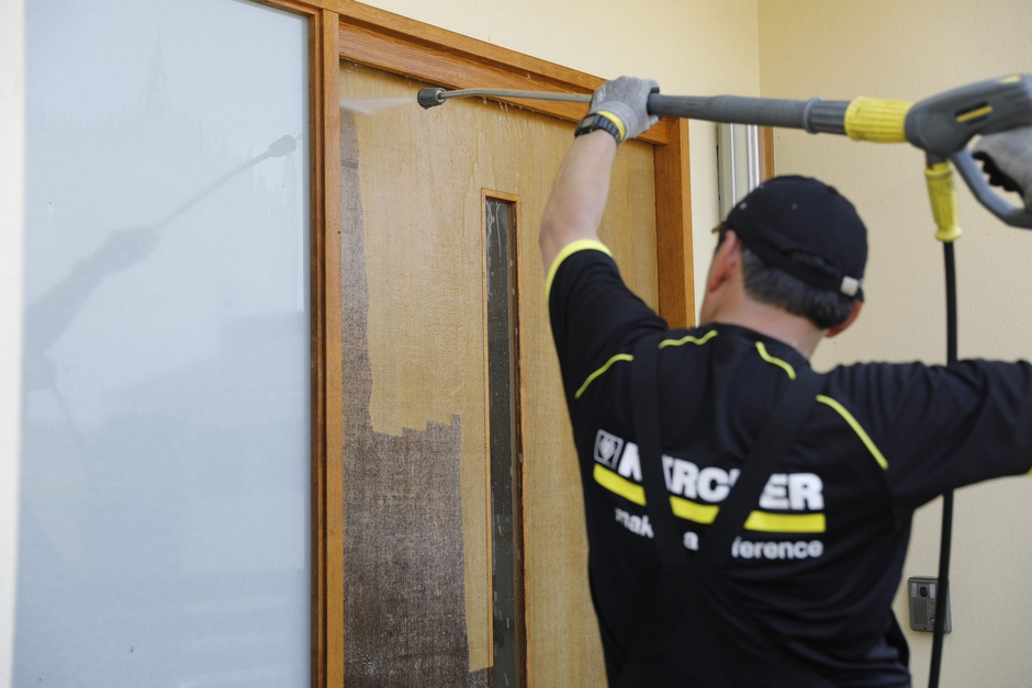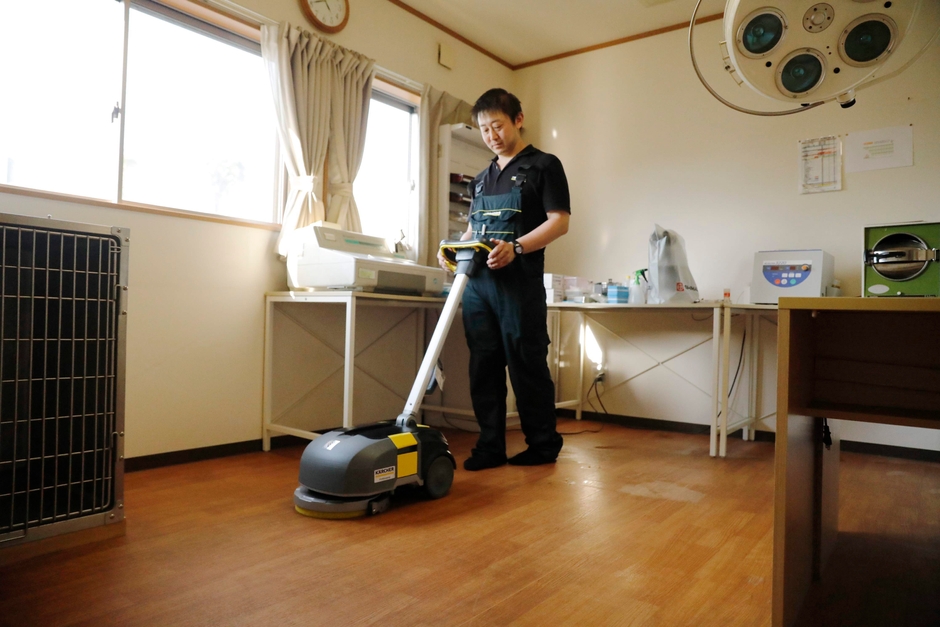 16日に引き続き、ケルヒャー ジャパンの洗浄チーム延べ14名で業務用高圧洗浄機「HDS 10/19 M」、床洗浄機「BD 30/4 C Bp」等を使用し、エントランスや犬舎、認定試験センター等の苔や排気ガスによる外壁の汚れ、床の脂汚れ等を洗浄しました。2日間合わせて約10時間の作業を行い、施設全体の洗浄が完了しました。