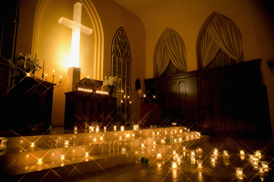 礼拝堂がキャンドルの無数の光に包まれ、美しい幻想的な教会をご覧いただけます。