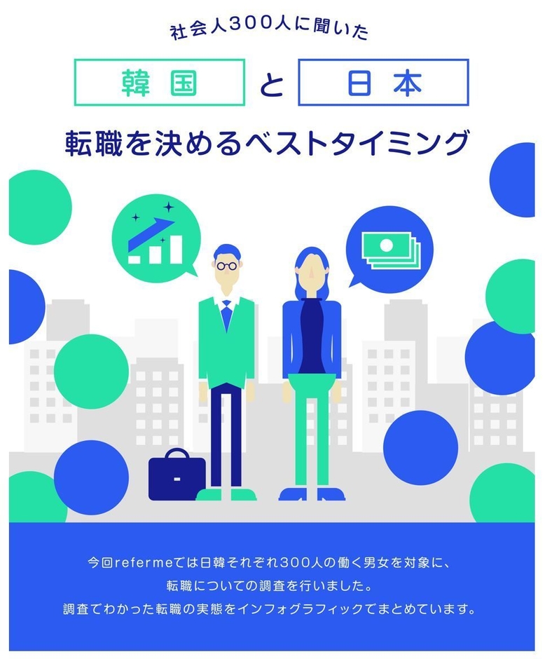 SNS時代の新しい転職プラットフォーム、referme(レファミー、代表:CHO HEEJOON、所在地:東京都港区)は、日韓それぞれ300人の社会人を対象にした調査インフォグラフィック『転職を決めるベストタイミング』を公開しました。