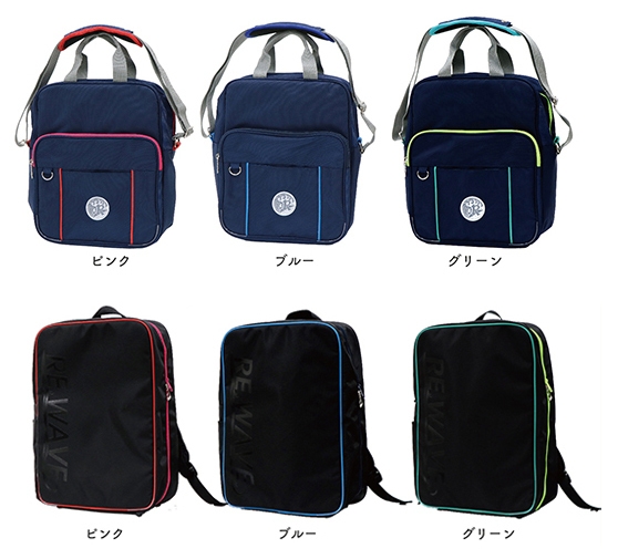 「Re:wave」通学カバンはショルダー型とリュック型の2種で、それぞれ3色展開。価格は8,532円~10,260円(税込小売希望価格)で、フットマークネットショップ「水着で元気工房うきうき屋」にて2018年3月14日より予約販売いたします。