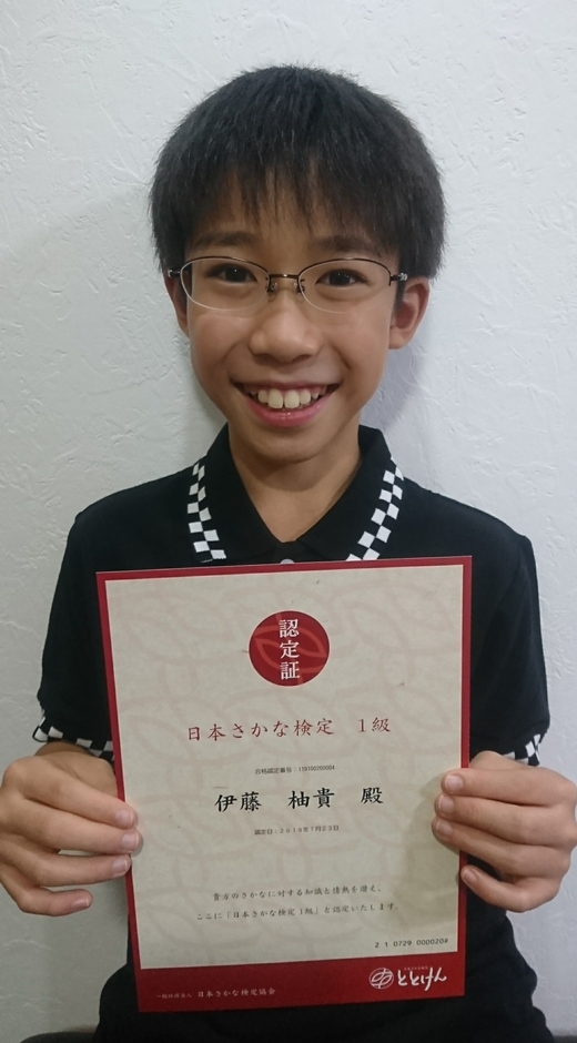 2019年6月23日(日)に全国7会場で行われた第10回日本さかな検定(主催:一般社団法人 日本さかな検定協会/東京都千代田区/代表理事:尾山雅一)で、福岡在住の10歳(小学5年生)の伊藤 柚貴くんが超難関の1級に合格しました。今年の1級は合格率8%弱(合格者 30名/受検者 388名 合格率7.7% 合格ライン80点)と例年に比べ難易度が高かったにもかかわらず、小学生のうちに合格という念願を見事に果たしました。
