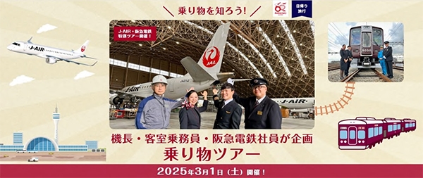 株式会社ジェイエア(本社:大阪府池田市、代表取締役社長:本田 俊介、以下「J-AIR」)、株式会社ジャルパック(本社:東京品川区、代表取締役社長:平井 登)と阪急電鉄株式会社(本社:大阪市北区、代表取締役社長:嶋田 泰夫)では、飛行機の格納庫と電車の車庫を乗務員と巡るツアーを、2025年3月1日(土)の1日限定で開催します。