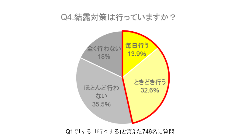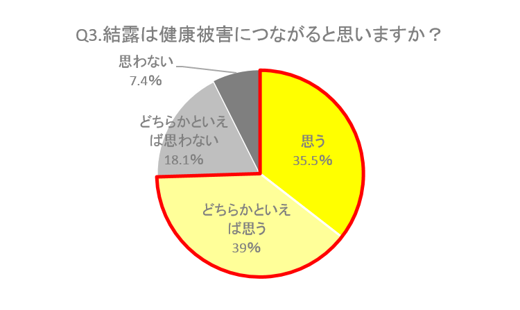 自宅で結露が発生する人は74.6%存在し、さらに結露が「住宅」に悪影響を与えると思っている人は9割以上、そして「健康」被害につながると考える人は7割以上に上ります。しかし、そこまで分かっているにも関わらず結露対策を行っている人は、Q1で結露が発生すると答えた人の半数以下という結果になりました。